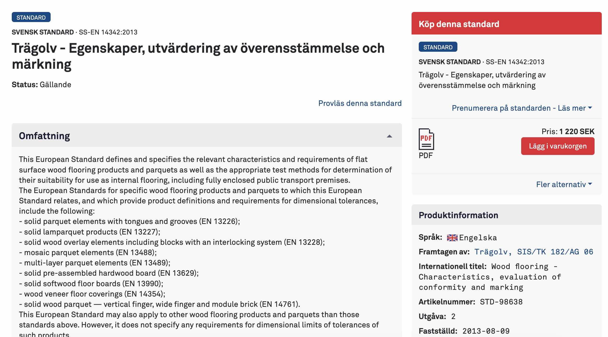 SS-EN 14342:2013 Trägolv – Egenskaper, utvärdering av överensstämmelse och märkning