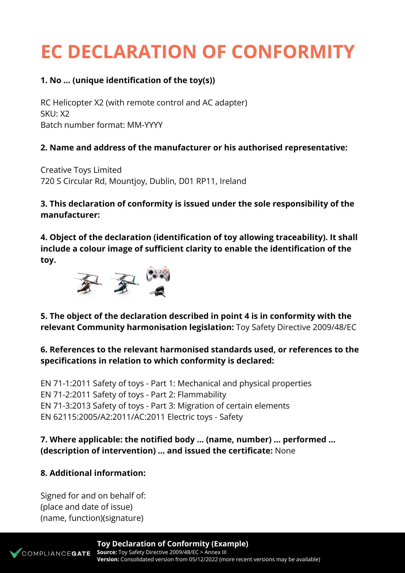 Leksaksdirektivet kräver att importörer och tillverkare kan bifoga en EU försäkran, vilket också kallas för Declaration of Conformity. En sådan måste innehålla följande information: